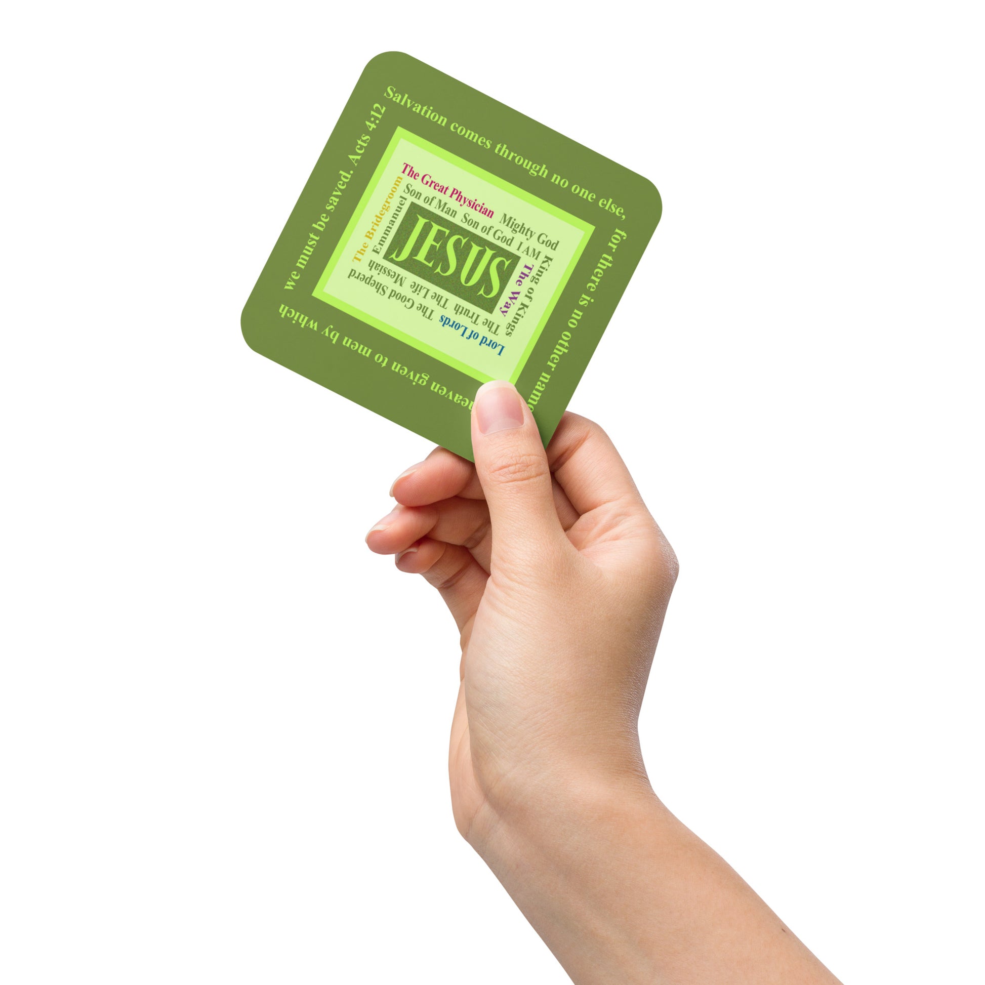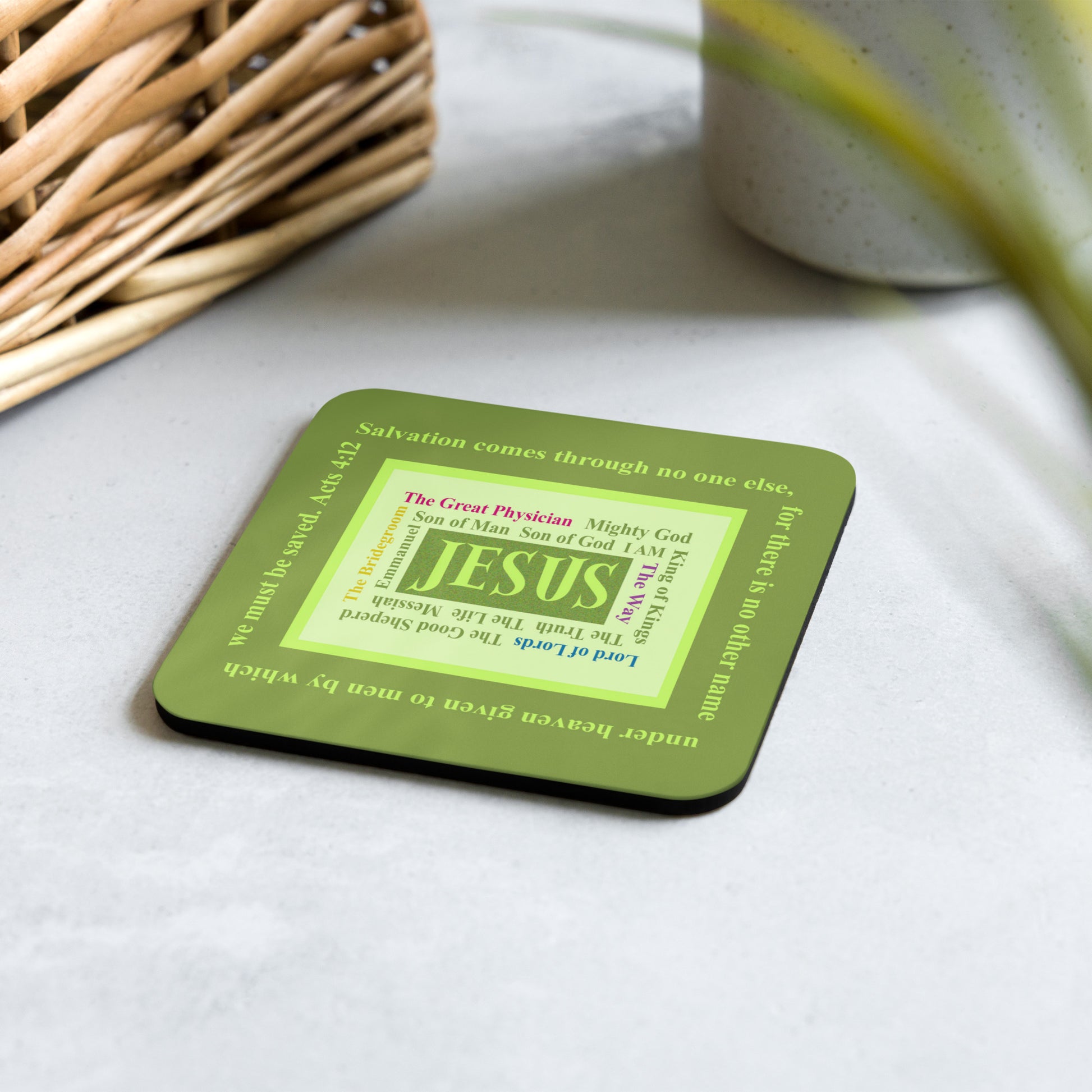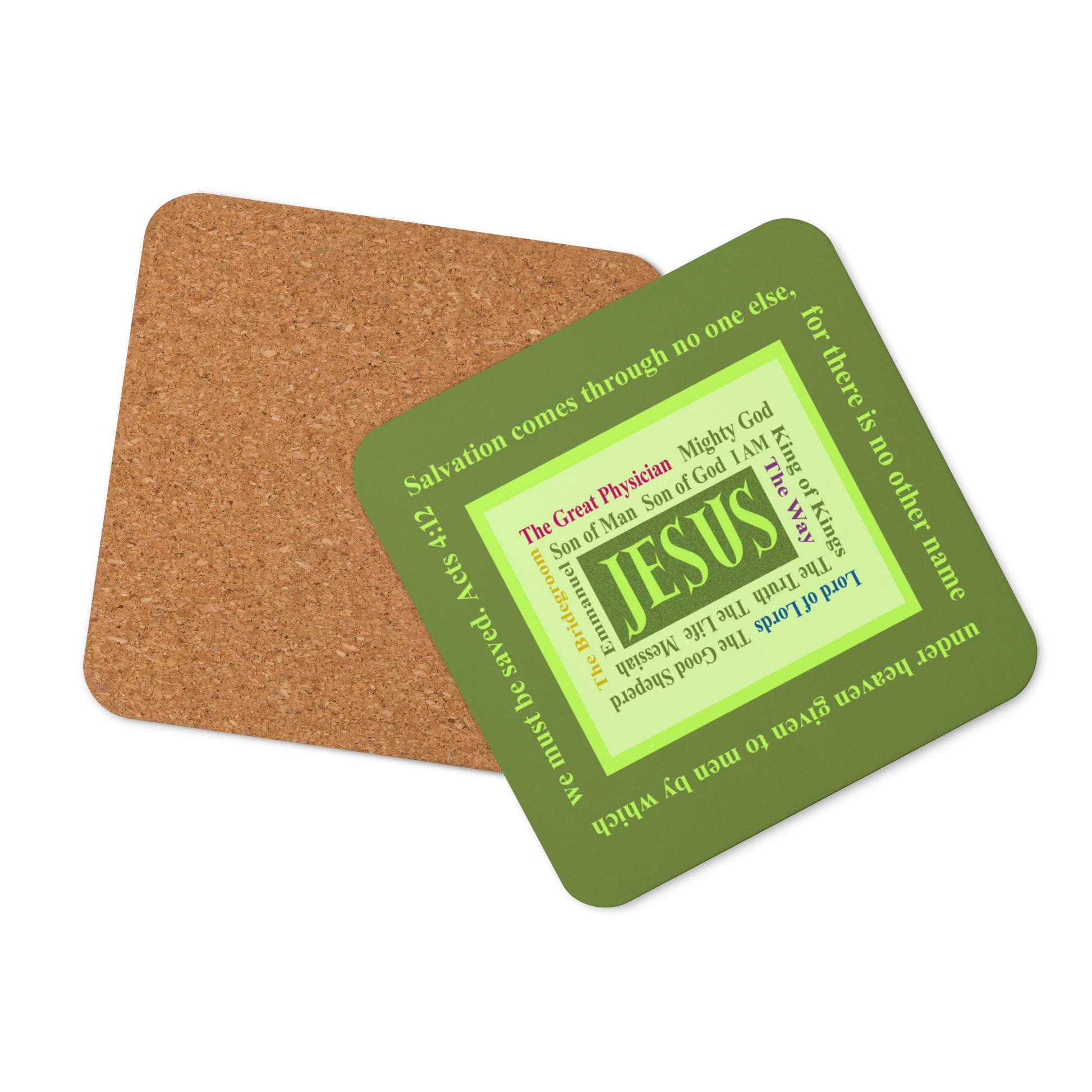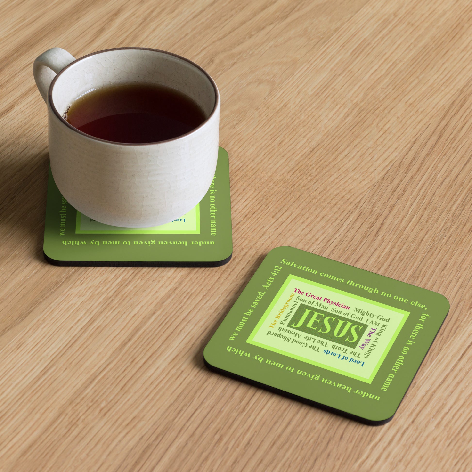Sip in style with this beautiful cork-back coaster, the perfect companion for your favorite mug! Built to last, this coaster is waterproof, heat-resistant, and packed with durability. Treat yourself or gift it to loved ones—it’s more than just a coaster; it carries God’s word, sharing a message of hope and transformation in every sip! The verse is Salvation comes through no one else. There is no other name under heaven given to men by which we must be saved. Acts 4:12